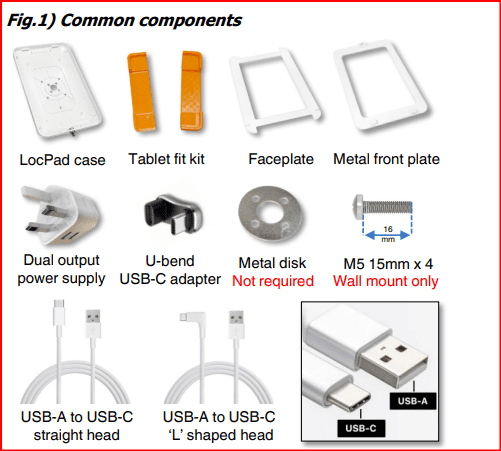 Fig 1) Common contents include the LocPad kit, consisting of: LocPad case, tablet ‘fit kit’, plastic faceplate, metal front plate and keys. There is a small pack with a round metal disk and 4 x 16mm screws. The disk is not required. The 15mm screws are for the wall mount only. All bundles also include two 3 metre power cables (one straight head, one ‘L’ shaped head), and a dual USB power supply.