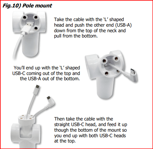 Fig.10) Thread the two power cables through the pole in order. First, take the cable with the ‘L’ shaped USB-C head, and thread the other end (USB-A) down the pole from the top. Then take the second cable, and thread the USB-C head up from the bottom. This is the same process for all pole types. This stage can be a bit tricky as the cable channel is quite tight. For the flexible mount, straighten the top of the mount so the channel goes straight down. If you find this too fiddly you could tie a piece of string/cotton thread around the cable and use this to pull the cable through.