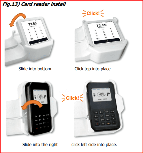 Fig.13) For the SumUp Solo, place the Solo into the bottom of the mount first as per the diagram. Run the power cable along the central channel, then ‘click’ the top of the reader into place. For the WisePad, the process is the similar. Place the WisePad into the right side of the cradle first as per the diagram. Run the power cable along the central channel, then ‘click’ the left side of the reader into place.