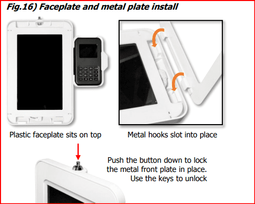 Fig.16) If there’s a brown paper protective covering on the plastic faceplate, peel it off. Lay the faceplate on top of the tablet, using the slots as guides. There are two hooks on the underside of the metal plate which should line up the appropriate receptacles on the rear part of the enclosure. Slot these in and pivot the rest of the metal plate down onto the enclosure. Press the barrel lock button to lock and secure the front metal plate in place. To release the tablet, insert the key into the barrel lock and rotate until the button ‘pops’ out to release the plate lock. If you have any questions at all, please just contact us for support.