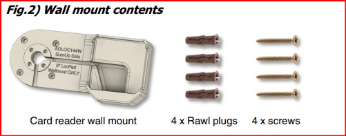 Fig 2) Wall mount contents include a card reader mount for either SumUp or WisePad. There are also four Rawl plugs and screws to fix the kiosk to the wall.