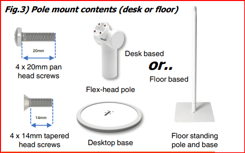 Fig 3) Pole mount bundles contain the components for either a desktop pole or a floor standing pole. The desktop solution has a tilt-head pole and a round, heavy desktop base. The floor standing solution has a 1.1m, pole with a fixed angle head, and a heavy floor base. Both pole mounts use the 14mm tapered head screws to attach the base to the bottom of the pole. They also use the 4 x 20mm pan head screws to attach the LocPad kiosk and card reader to the head of the pole.