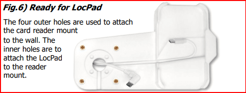 If you have a wall mount, the LocPad case is already attached to the wall. Fig.14) If you have a pole mount, you need to position the LocPad case onto the card reader cradle, and the card reader cradle onto the pole. Here, make sure you click the 4 "pegs" of the cradle into the locpad rear enclosure. press down evenly on the centre of the enclosure to ensure they fit snug.
