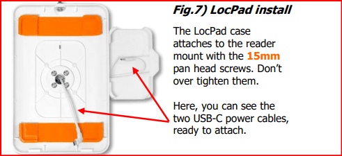 Fig 7) To install the LocPad case, Feed the right-angled USB-C cable through the central hole of the case and place the LocPad into the central round section. Use the supplied 15mm screws to attach the card LocPad to the reader mount.