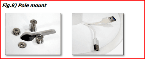 Fig.9) Install the pole onto the base (desk or floor) using the four tapered M5 screws supplied. The slot on the base can be used to thread the USB cables out of the back of the base.